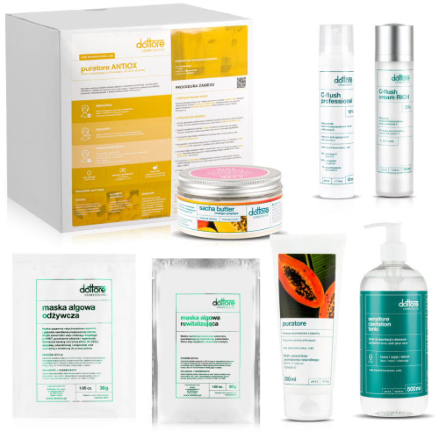 Dottore Puratore Antiox Zestaw Zabiegowy to kompletny pakiet potrzebny do przeprowadzenia serii zabiegów oczyszczających wspomagających skórę w walce z problemem szarej i ziemistej cery, jak również poprawiającym jej ogólną kondycję, wyrównującym koloryt oraz odbudowującym barierę hydrolipidową. Wszystkie wskazane efekty uzyskujemy za sprawą unikalnego połączenia enzymatycznego peelingu z papainą oraz odżywczej siły naturalnych maseczek algowych. Całość wspiera masło do masażu ciała z wysoką zawartością kwasów omega 3 i 6. Podczas regularnych zabiegów skóra odzyskuje naturalny blask oraz zostaje zregenerowana i odżywiona. Do zestawu dołączono serum przeciwzmarszczkowe, które dodatkowo wzmacnia działanie substancji aktywnych podawanych podczas zabiegów.