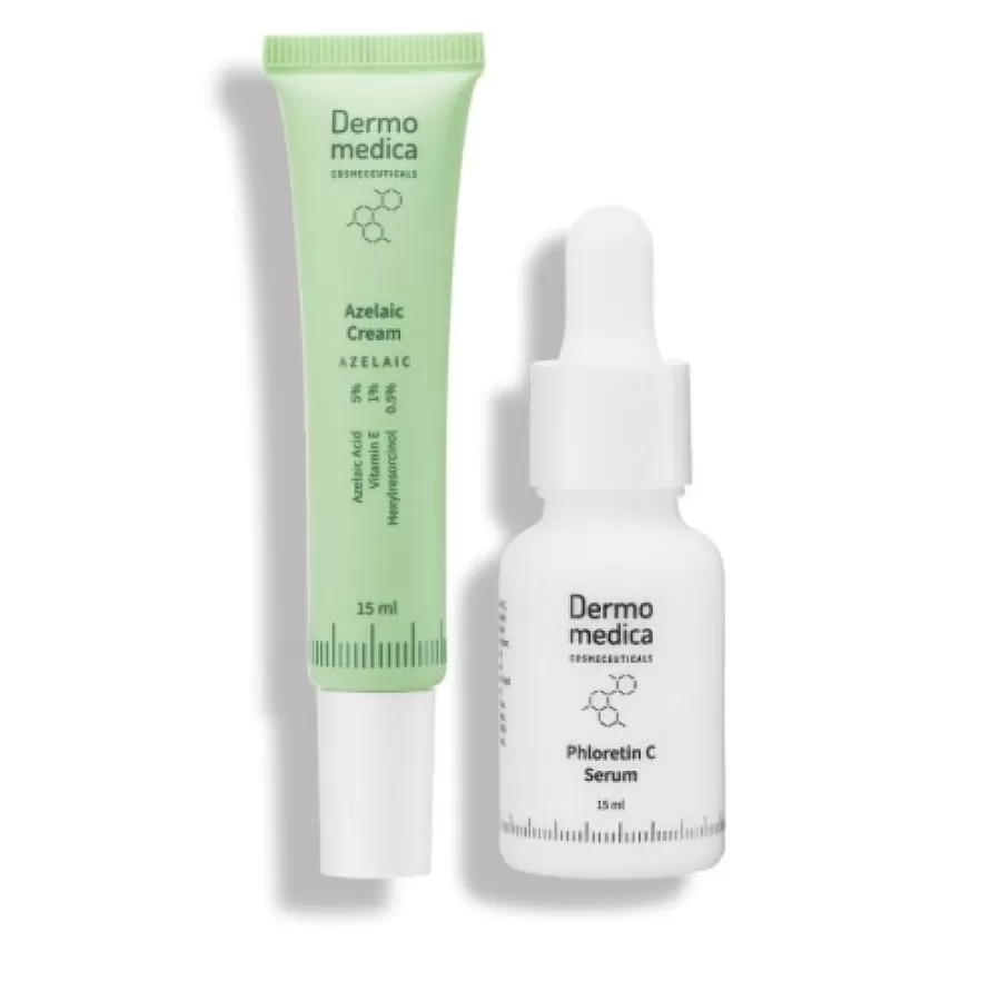 Use Phloretin C serum for a day. Apply 4-5 drops of Serum Phloretin C to the cleaned skin of the face, neck and cleavage and massage slightly. Using vitamin C serum, use Dermomedica Antioxidant Mineral Cream SPF 30 daily Apply Azelaic cream overnight after a two-stage facial cleansing. Remember to avoid the eye area.
